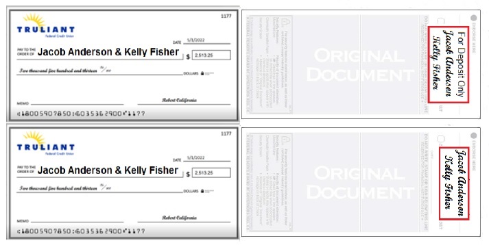 - All Payees will endorse the back of the check by writing “For Deposit Only” and signing their legal names below it.